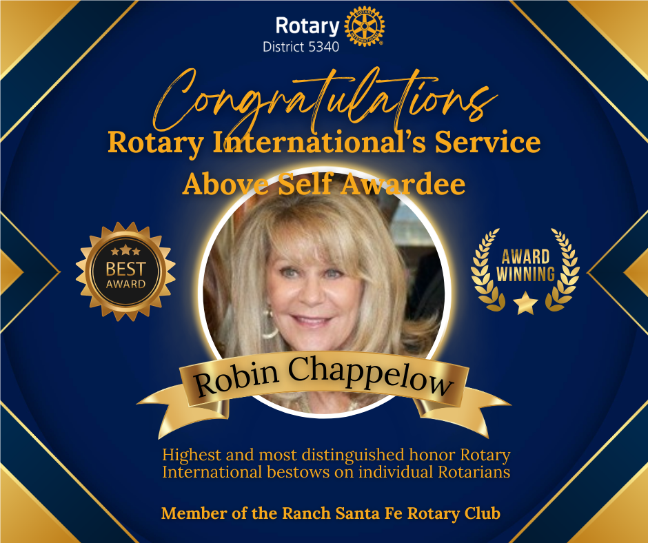 District 5340 is proud to announce that Robin Chappelow of the Rotary Club of Rancho Santa Fe has been selected as a recipient of Rotary International’s Service Above Self Award, the highest and most distinguished honor Rotary bestows on an individual Rotarian.